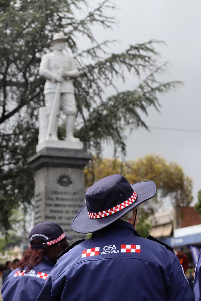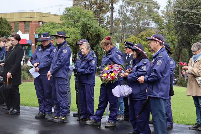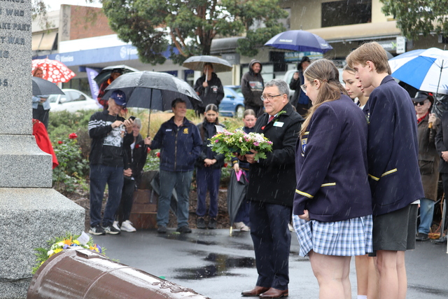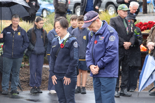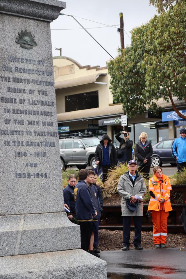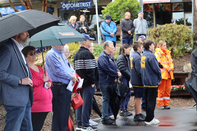Umbrellas and winter clothing donned, the flag at half mast, the Lilydale CFA siren sounded over the township of Lilydale as the community gathered in sombre silence at the War Memorial.
