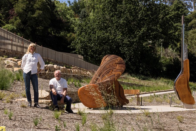 The rejuvenated space is designed to integrate with the wider parkland, with the sculptural elements made of natural materials, designed pathways and revegetation with native species.